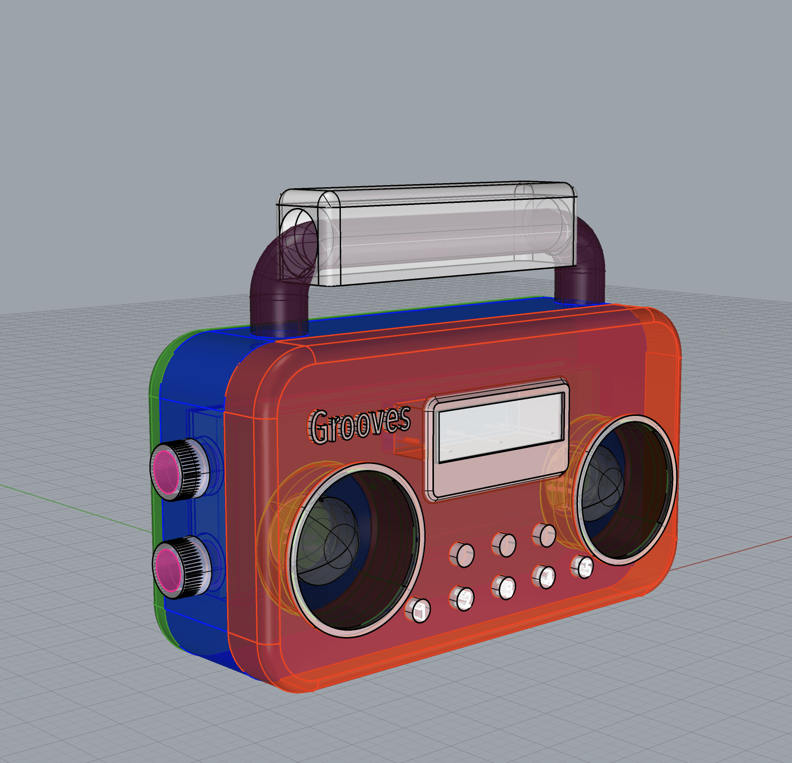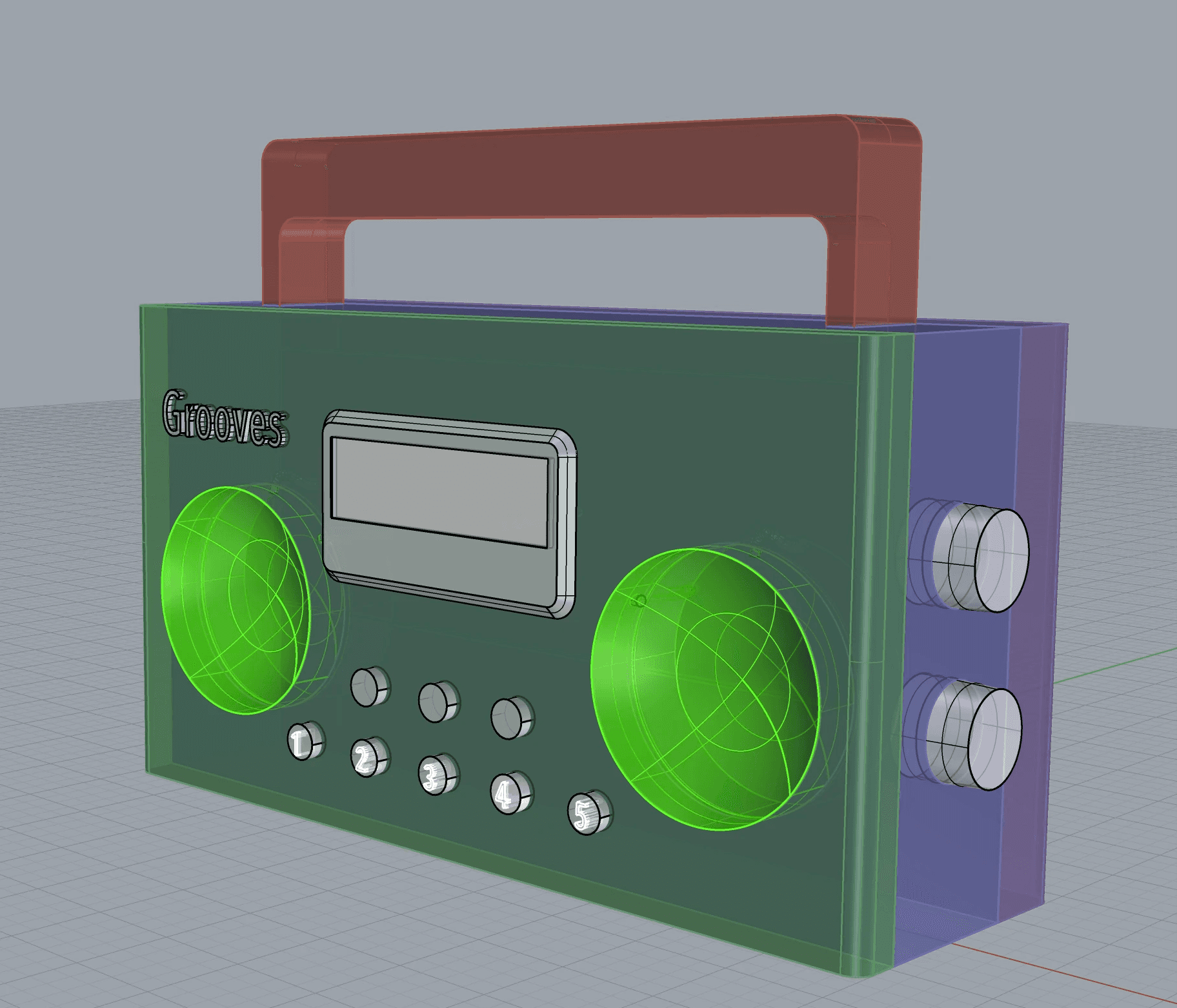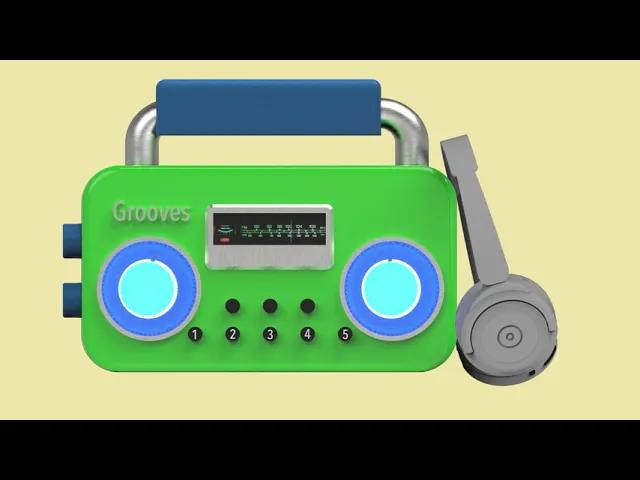 Grooves BoomBox is 3D modeled radio based off the asethics and working parts of boombox radio in the 80s.